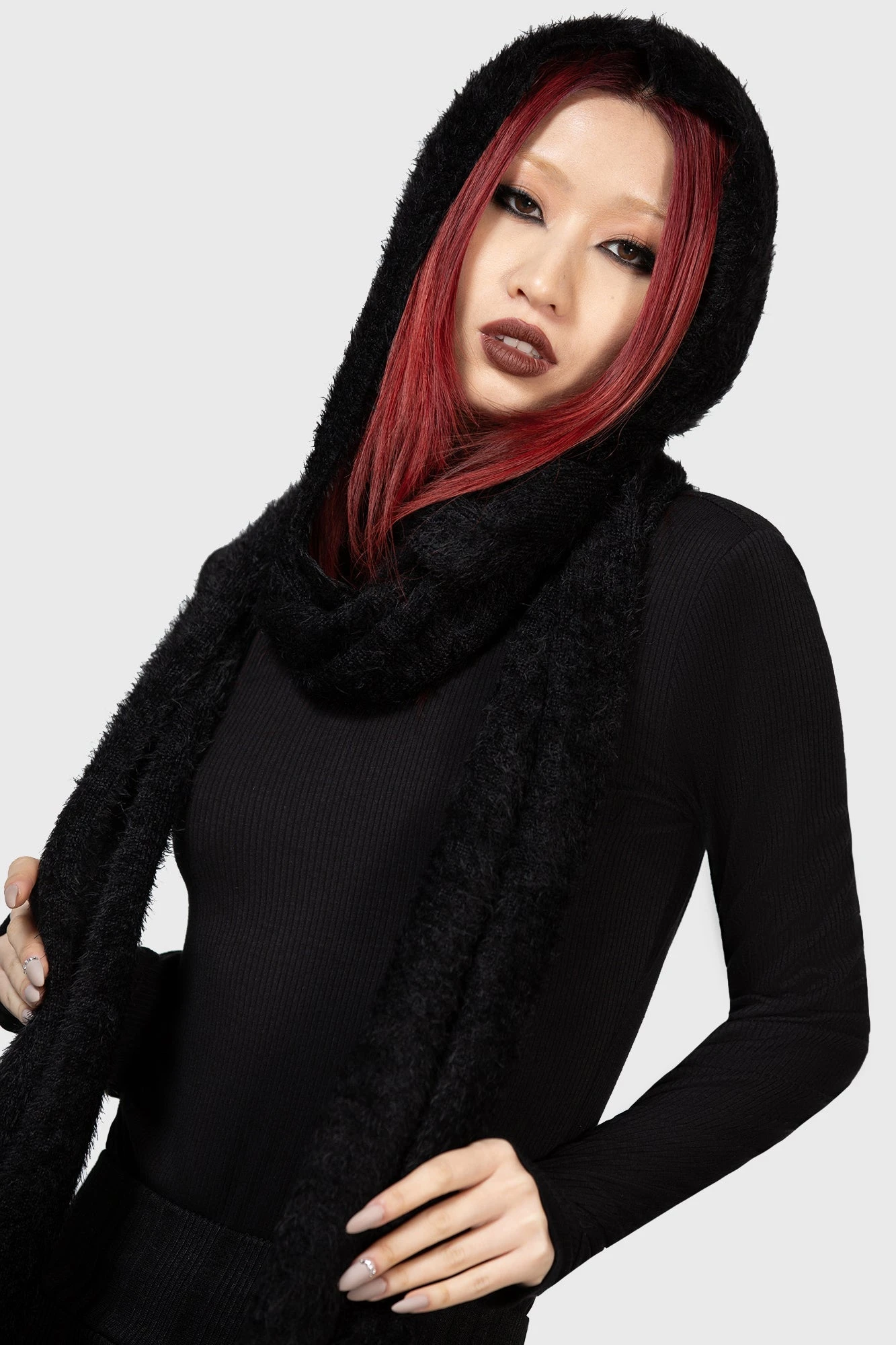 – Statement hooded scarf.