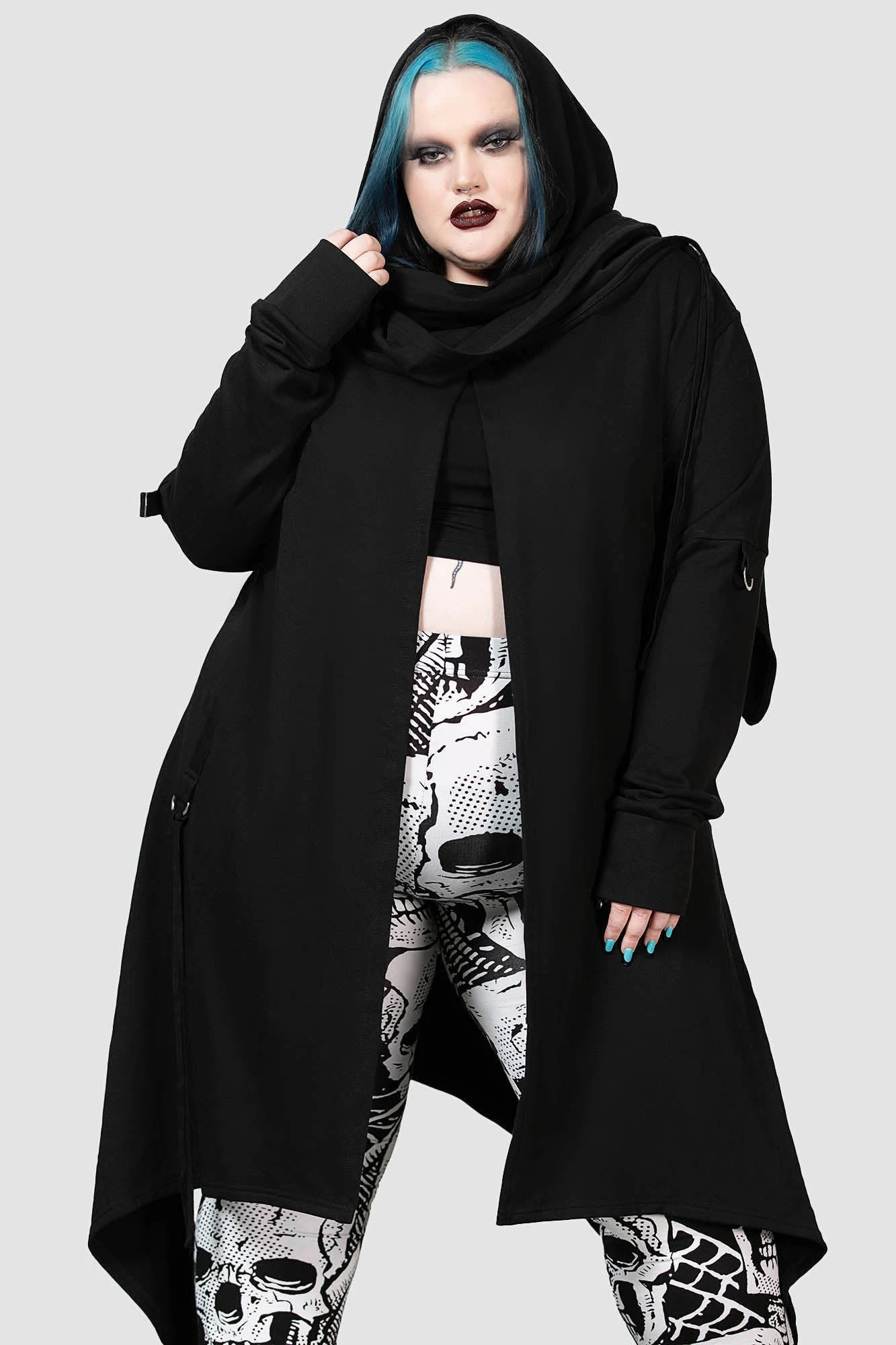 By the grace of the devil we give you this versatile and oh-so[ul]-lustful jersey cardigan; ‘Assassins’ is a dark layering piece with an oversized hood, draping + long length front, uneven hems and D-ring details to sleeves – complete with thumbholes. Yer ready for your midnight calls, dark baptisms or just plain old chill/thrill/kill – a guaranteed head-turner!