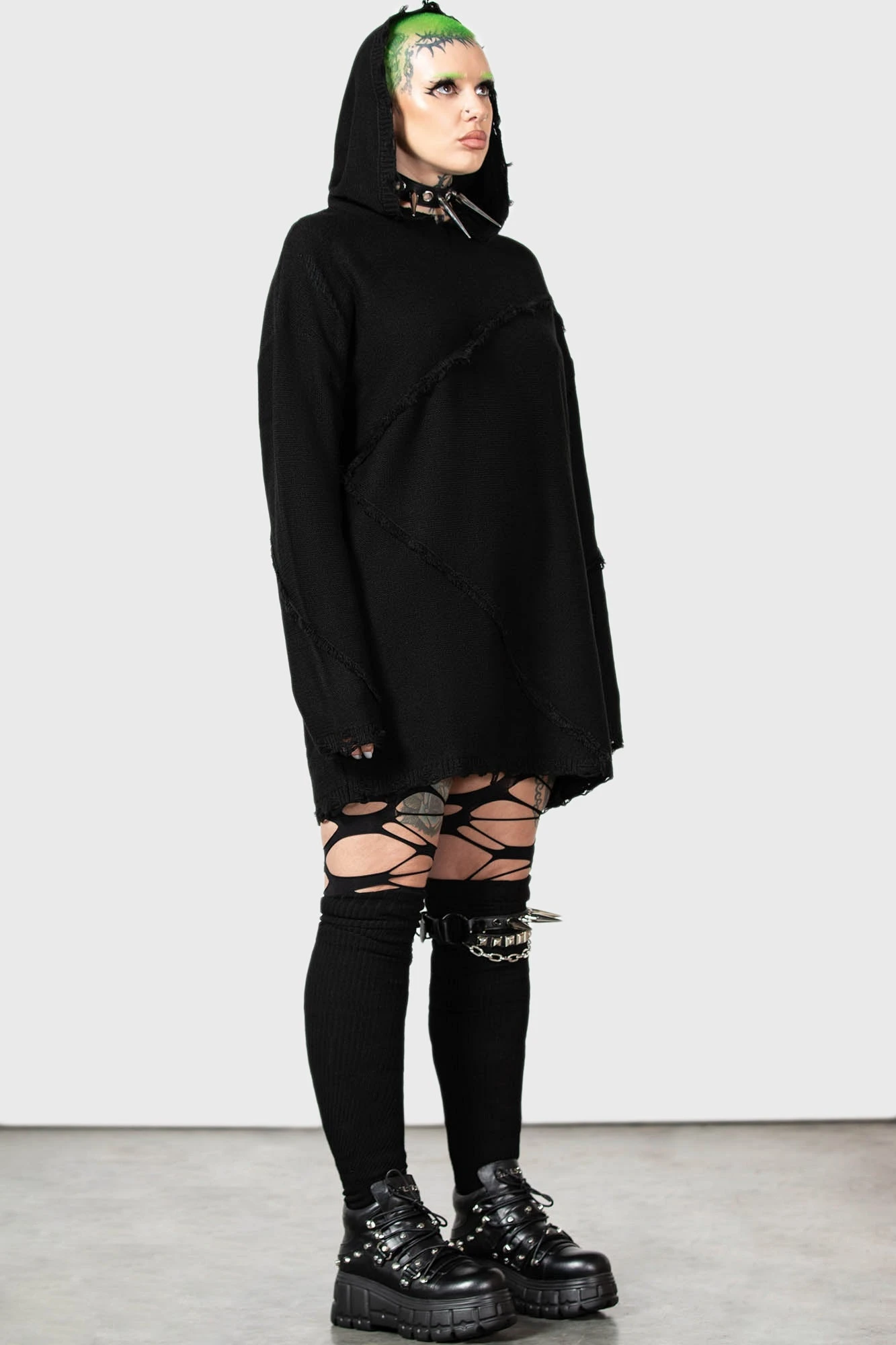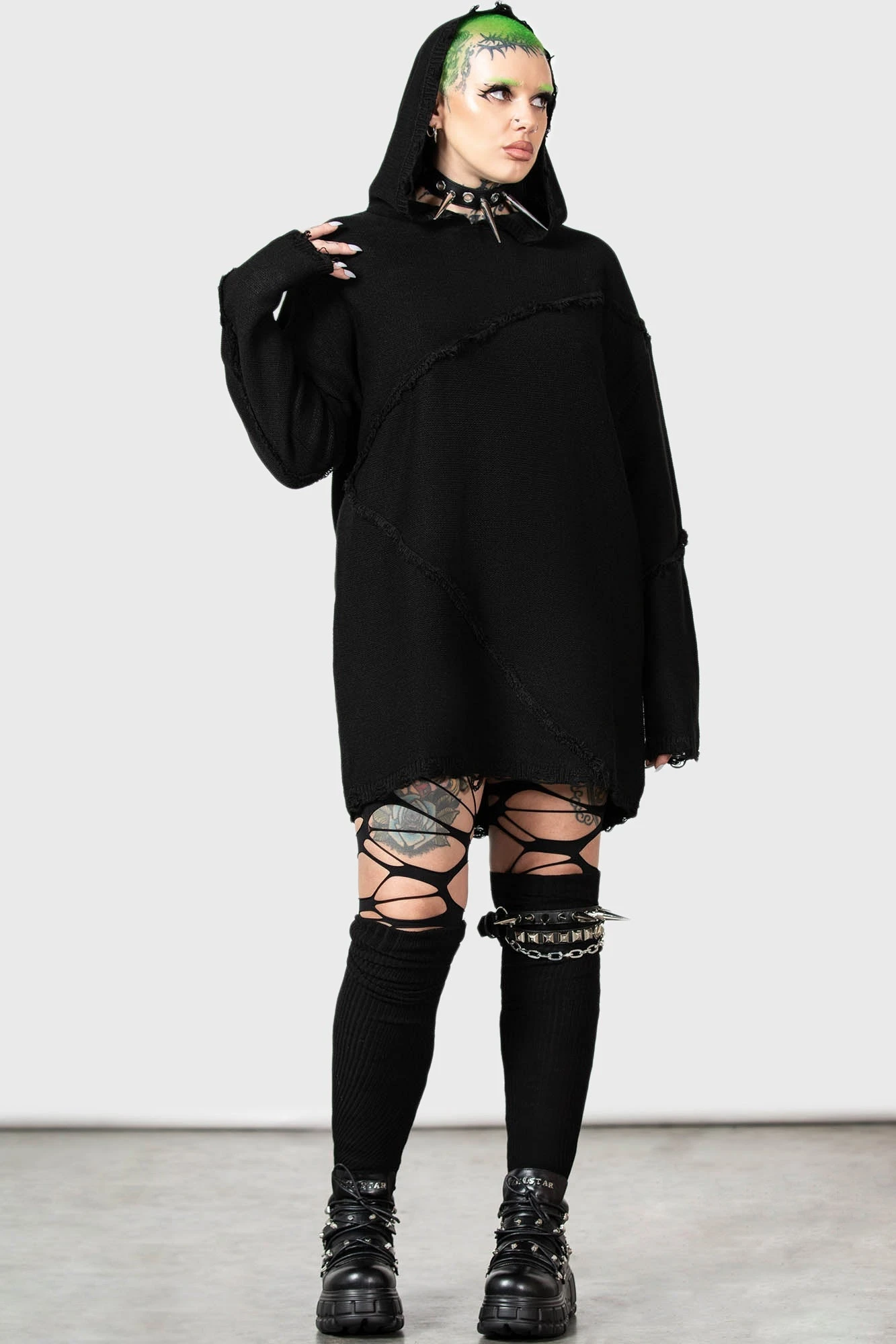 Model with green hair is 5ft 6 and wears a size L for an oversized look.