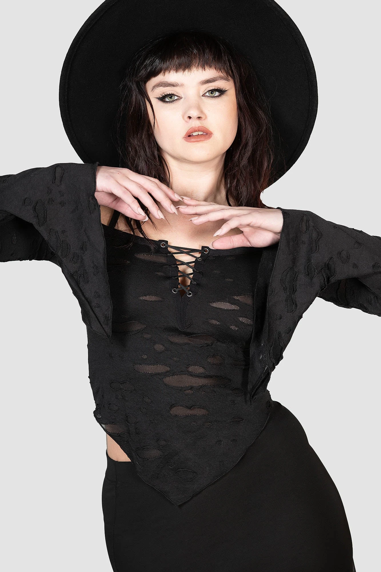 There is a new ghoul in town; cast yer eyes on the ‘Dust Devil’ top – with a light but flattering fit – perfect for hot days/nights/whatever. Soft-touch fabric body with bardot neck, statement lace-up front, waterfall sleeves and distressed design.