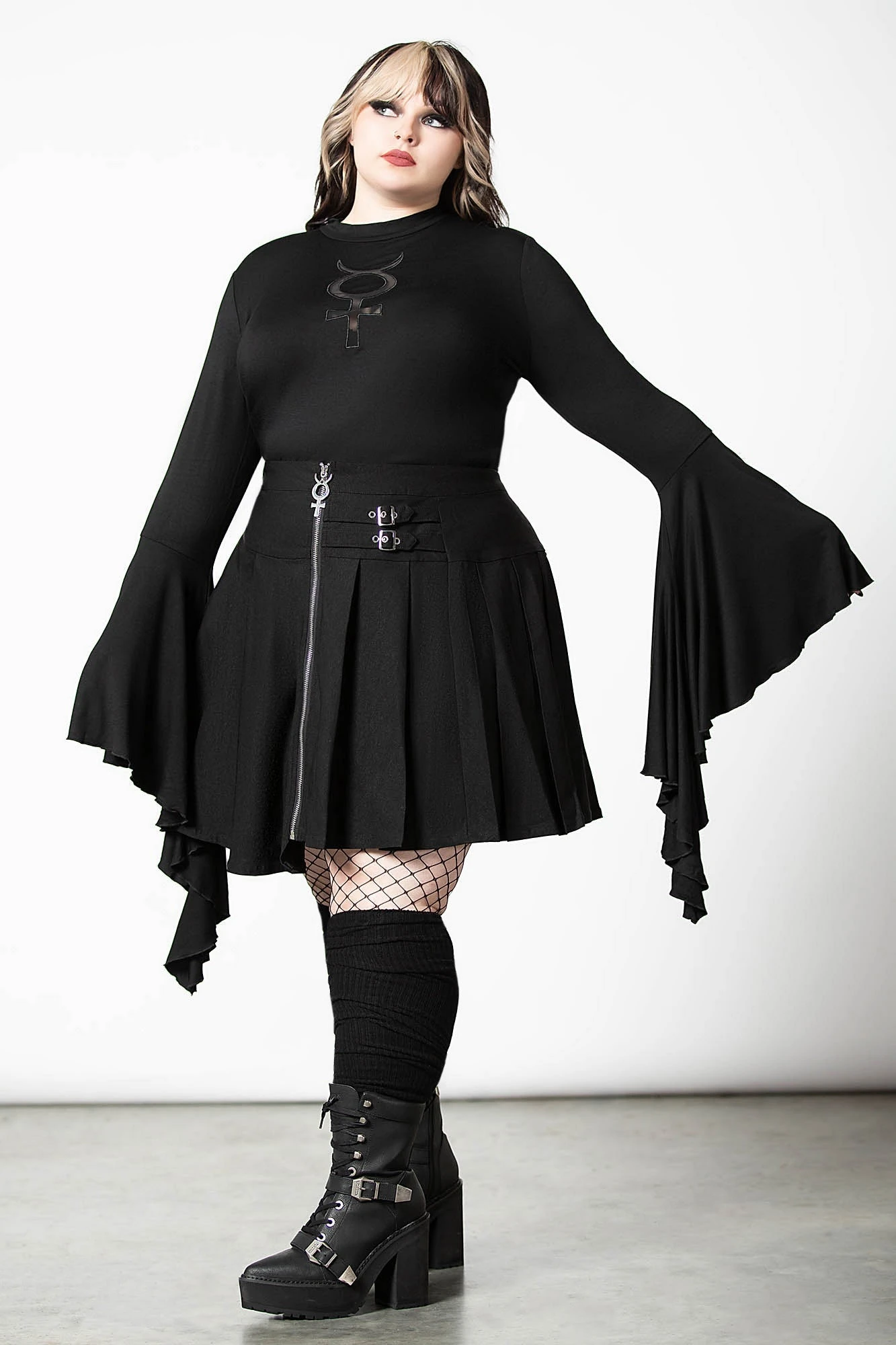 Face your fears in our ‘Elemental Eclipse’ Crop top. Crafted in soft, stretch fabric for a killer fit, with dramatic XL waterfall sleeves and finished with a high neck and Mercury glyph mesh cut out. Perfect to wear out watching the stars or for a casual card reading.