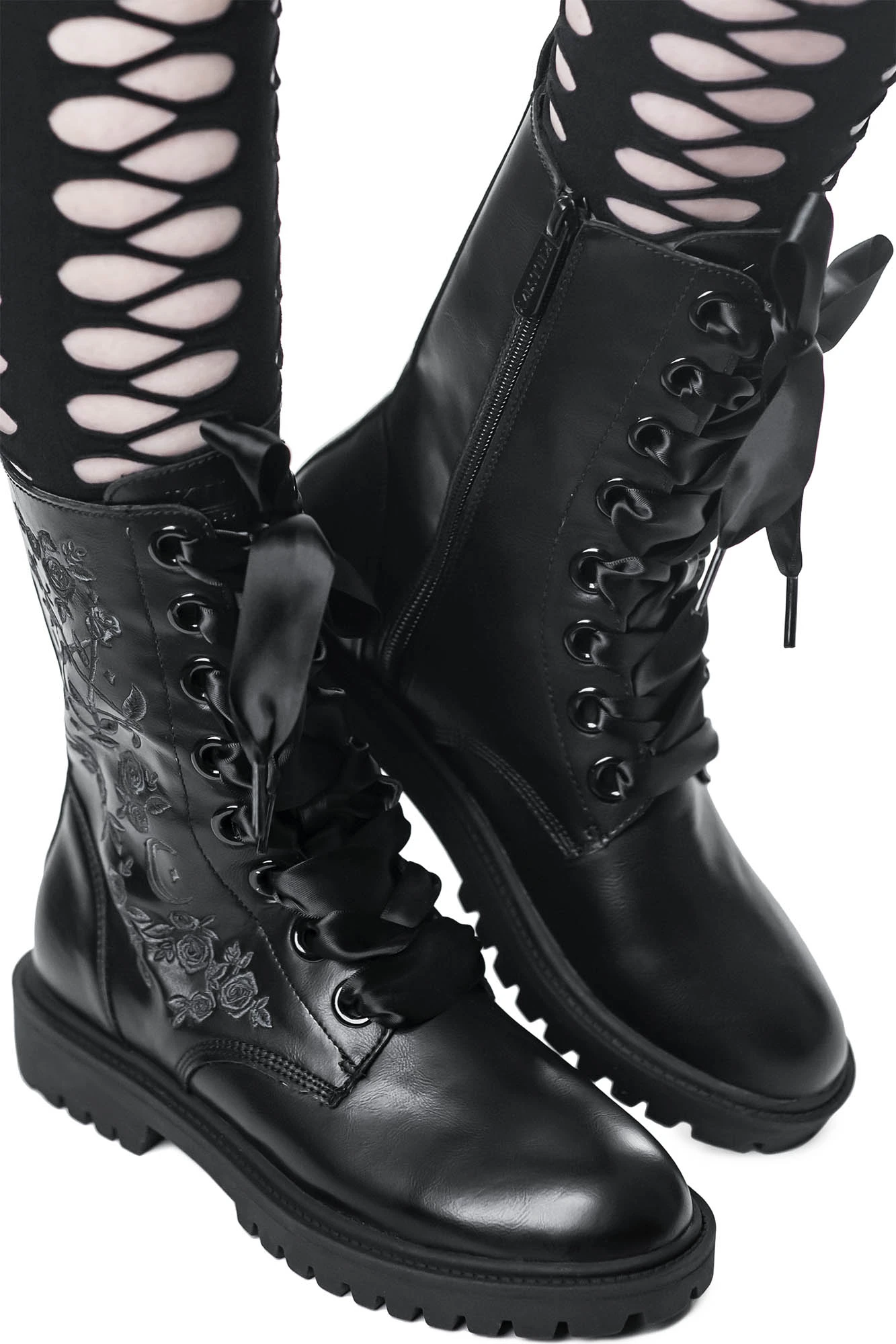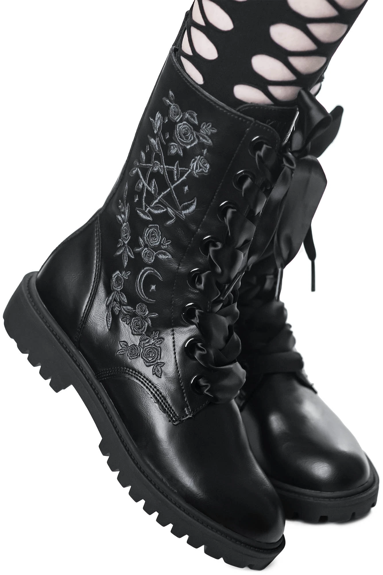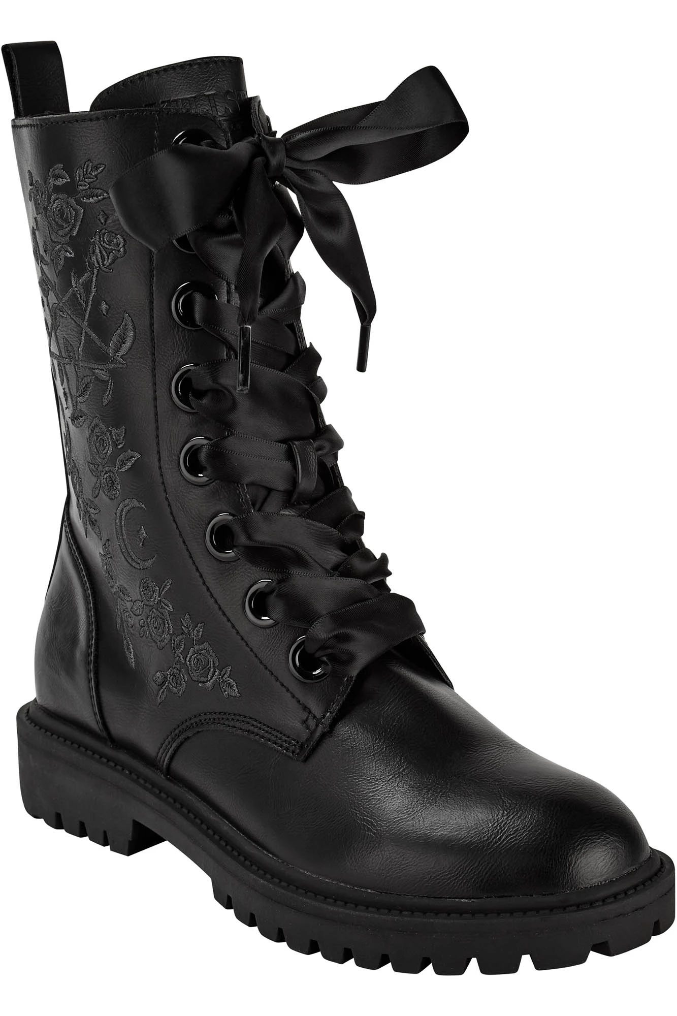 Create your own fairytale with the ‘Enchanted’ combat boots; featuring a textured faux-leather body with a satin lace-up front plus statement embroideries of pentagrams, roses, and crescent moons. Complete with slightly-elevated sole and side zip for easy on/off. Perfect for your dusk-to-dawn adventures!