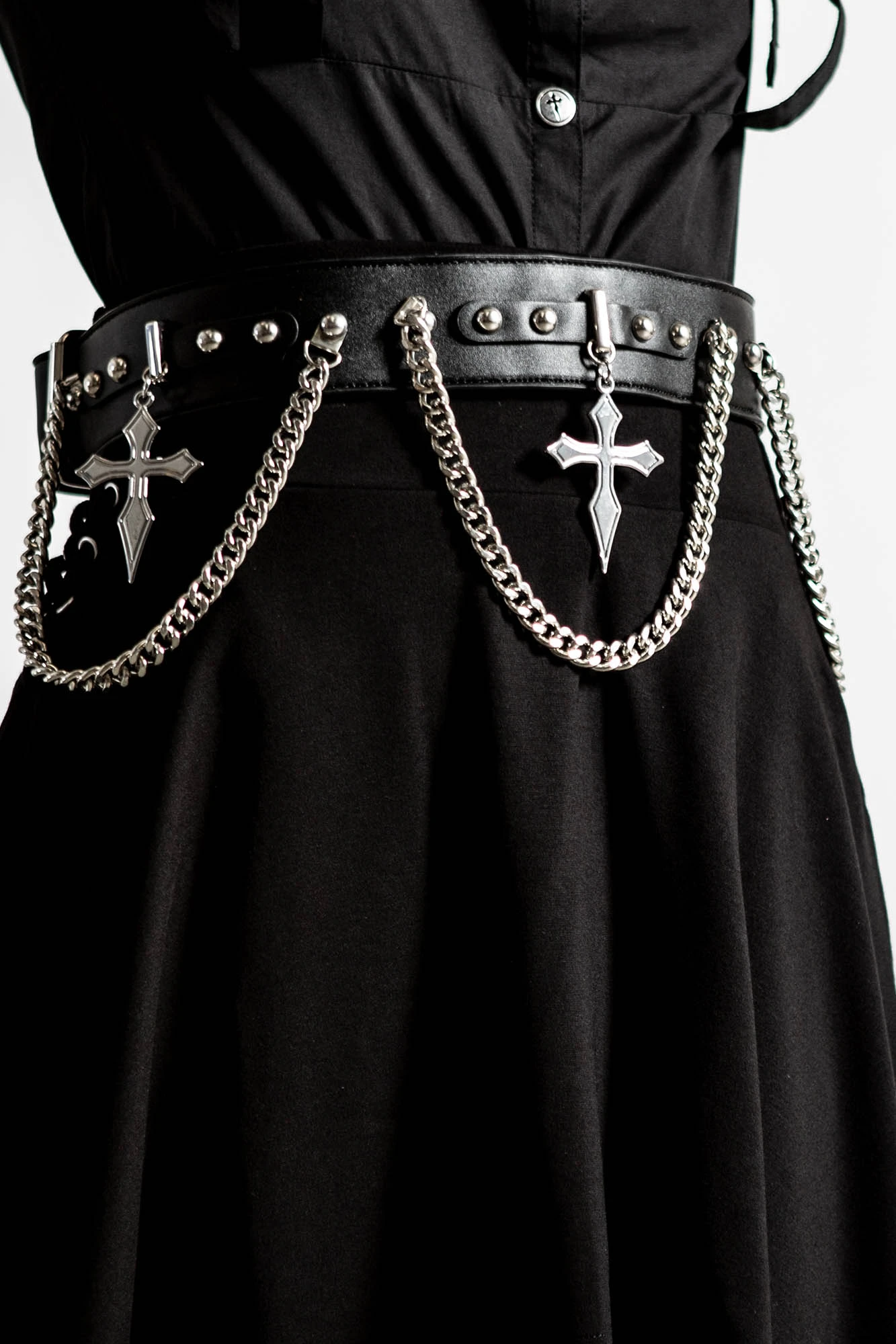 Add some instant drama to yer daily rituals; faux leather in a double-layer body with contrasting silver hardware; studded, cross charms and chainz. High Waist fit – looks seriously killer on bodycon dresses or fishnet!