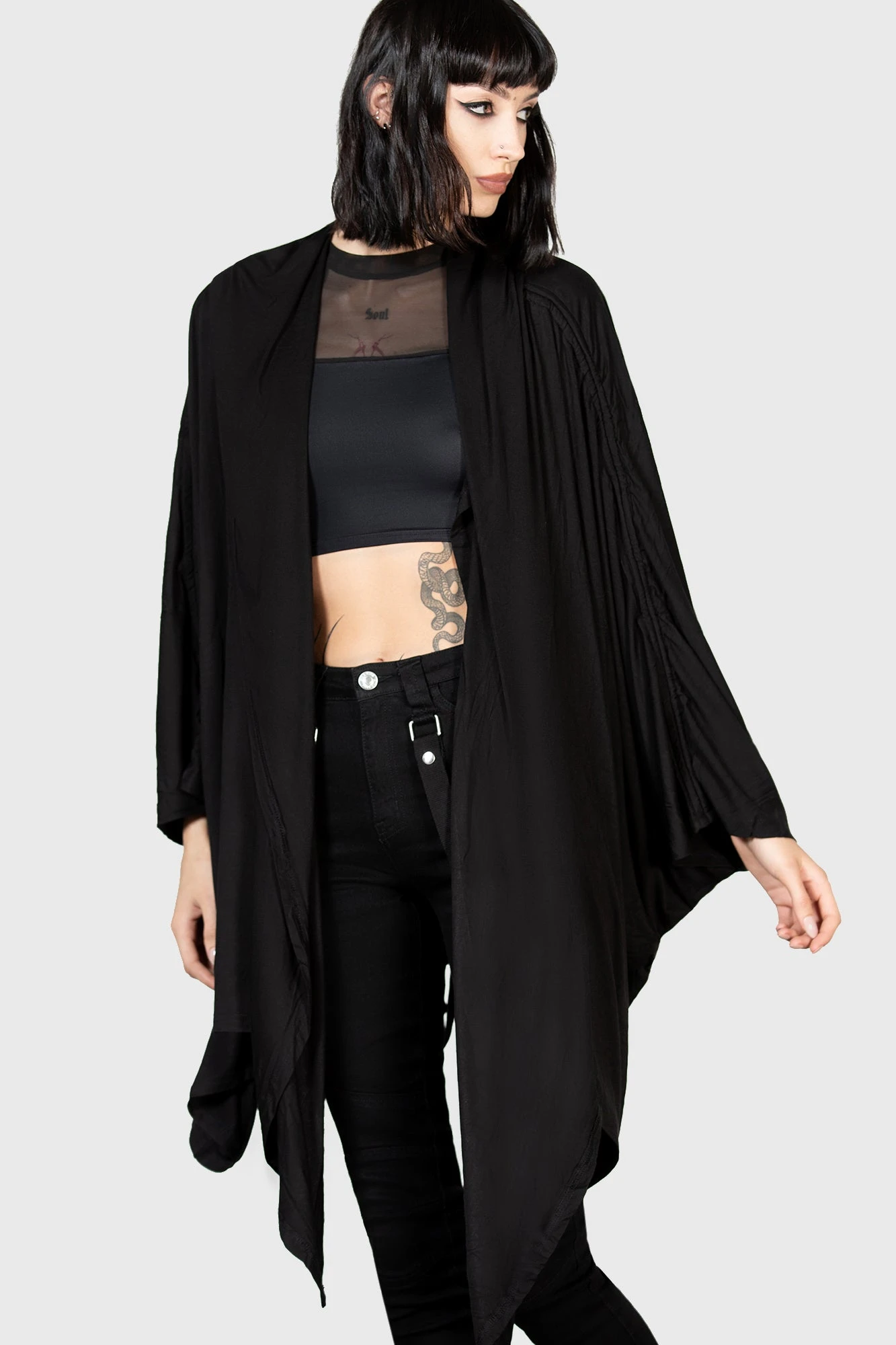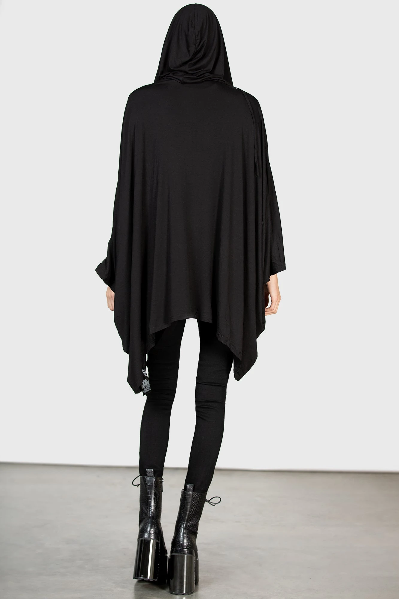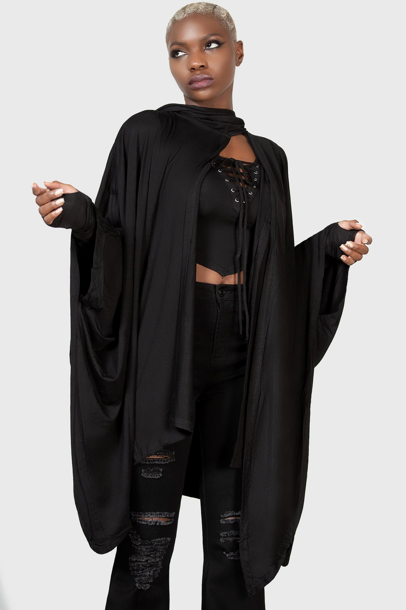 Life is one big ritual; the spellbinding ‘In The Shadows’ statement cloak is conjured of the softest stretch-fabric; for superior comfort and fit. Featuring a draping body, oversized hood, and open front. Ideal for layering – transforms your daily routine to a magical expression – perfect for festivals, midnight ceremonies, and hot dates.
