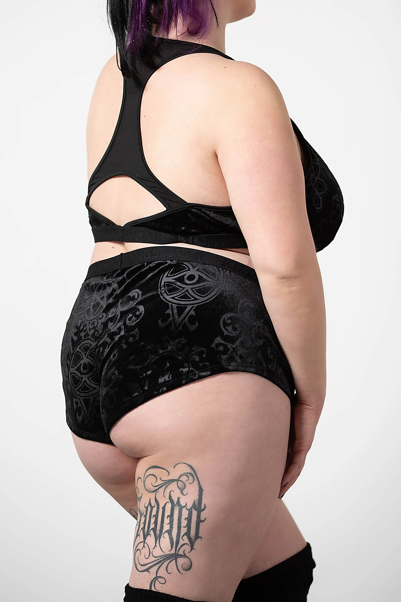 Designed with movement in mind, get in the zone in our ‘Moody’ panty. Crafted in our super strong, stretch fabric with a black-on-black statement print you’ll have the power to possess. A perfect staple for your active witch wardrobe!