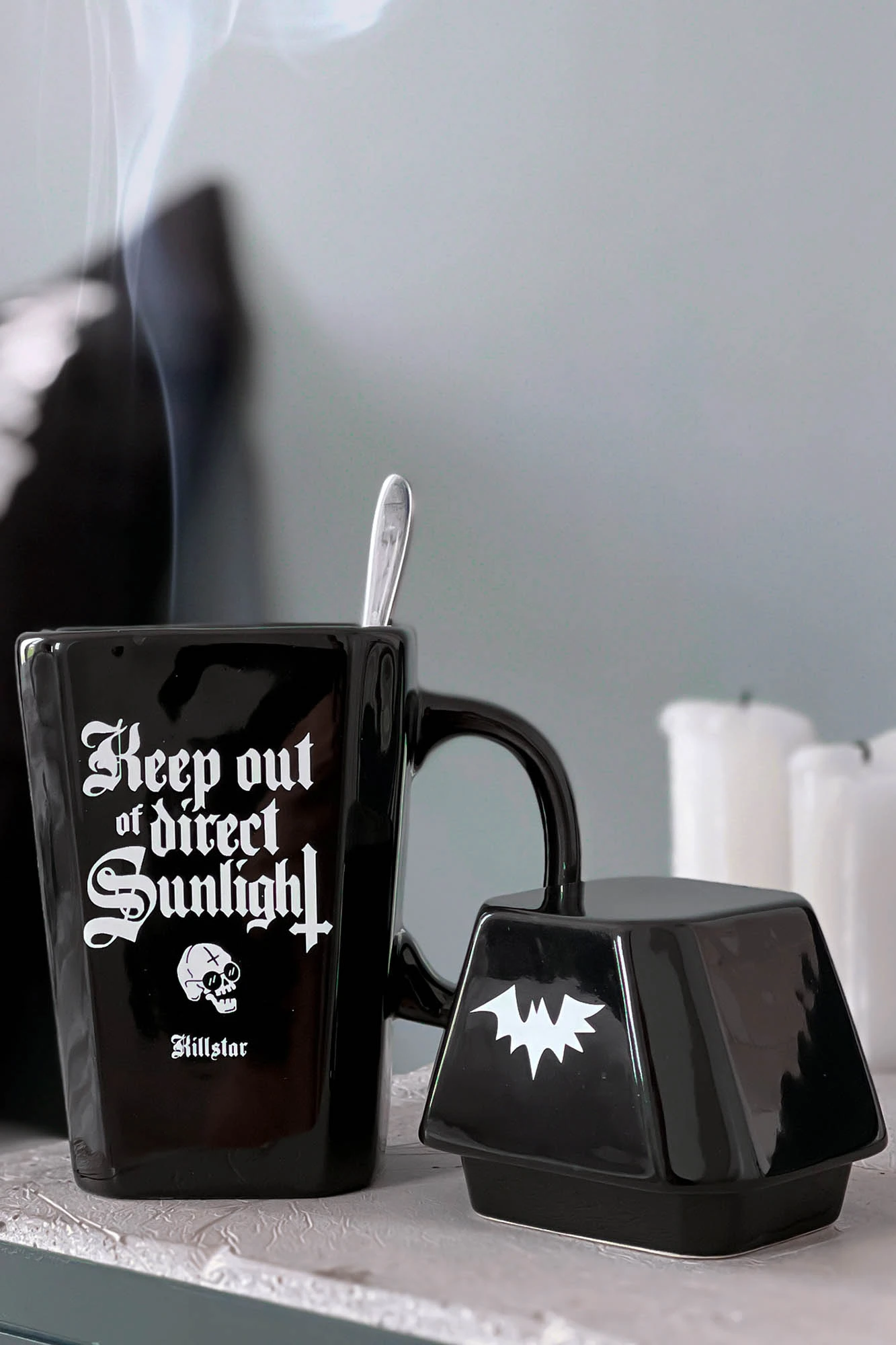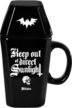Drinking coffee to make mortals bearable since 1819. In a coffin shape, large in size and spooky contrasting print – good enough for even Dracula himself!