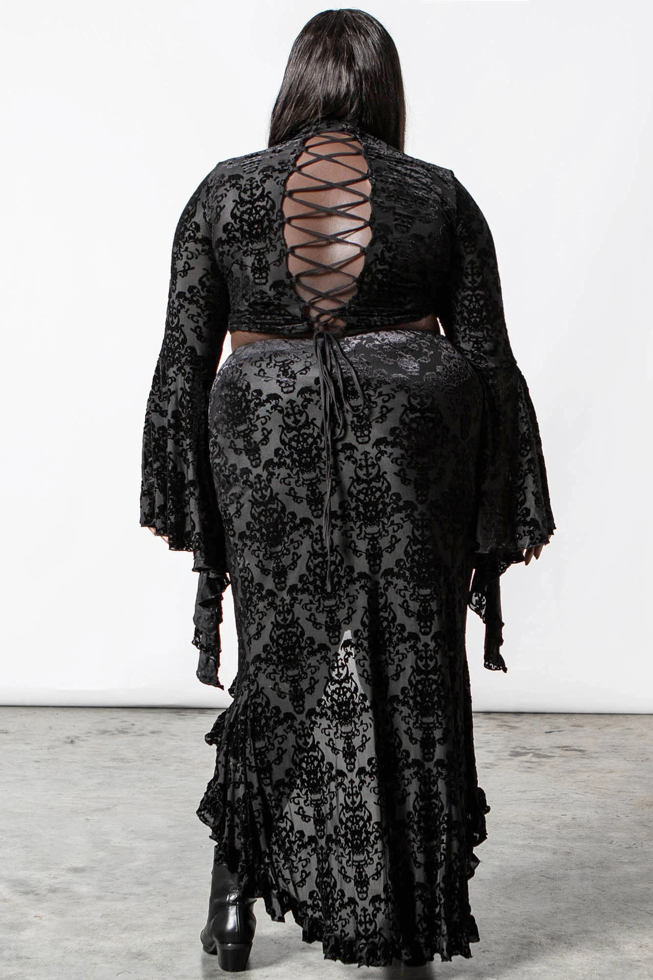 The ‘Para Bellum’ maxi skirt is perfect from dusk to dawn; featuring a body of our soft burnout velvet for a figure-hugging fit! Complete with elastic waist, statement frill and dramatic slit. A perfect wardrobe staple that can be dressed up or down as your dark heart desires!