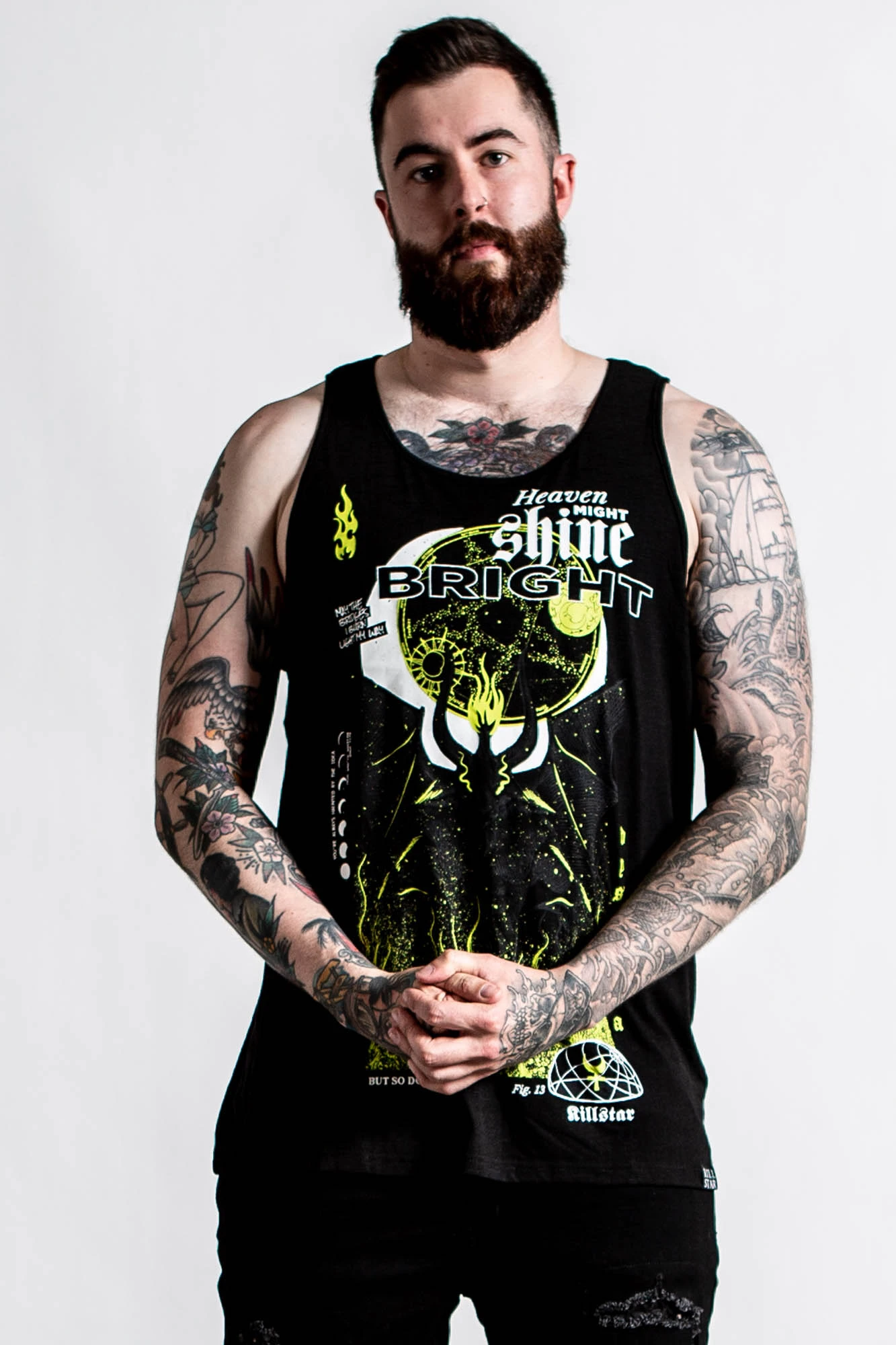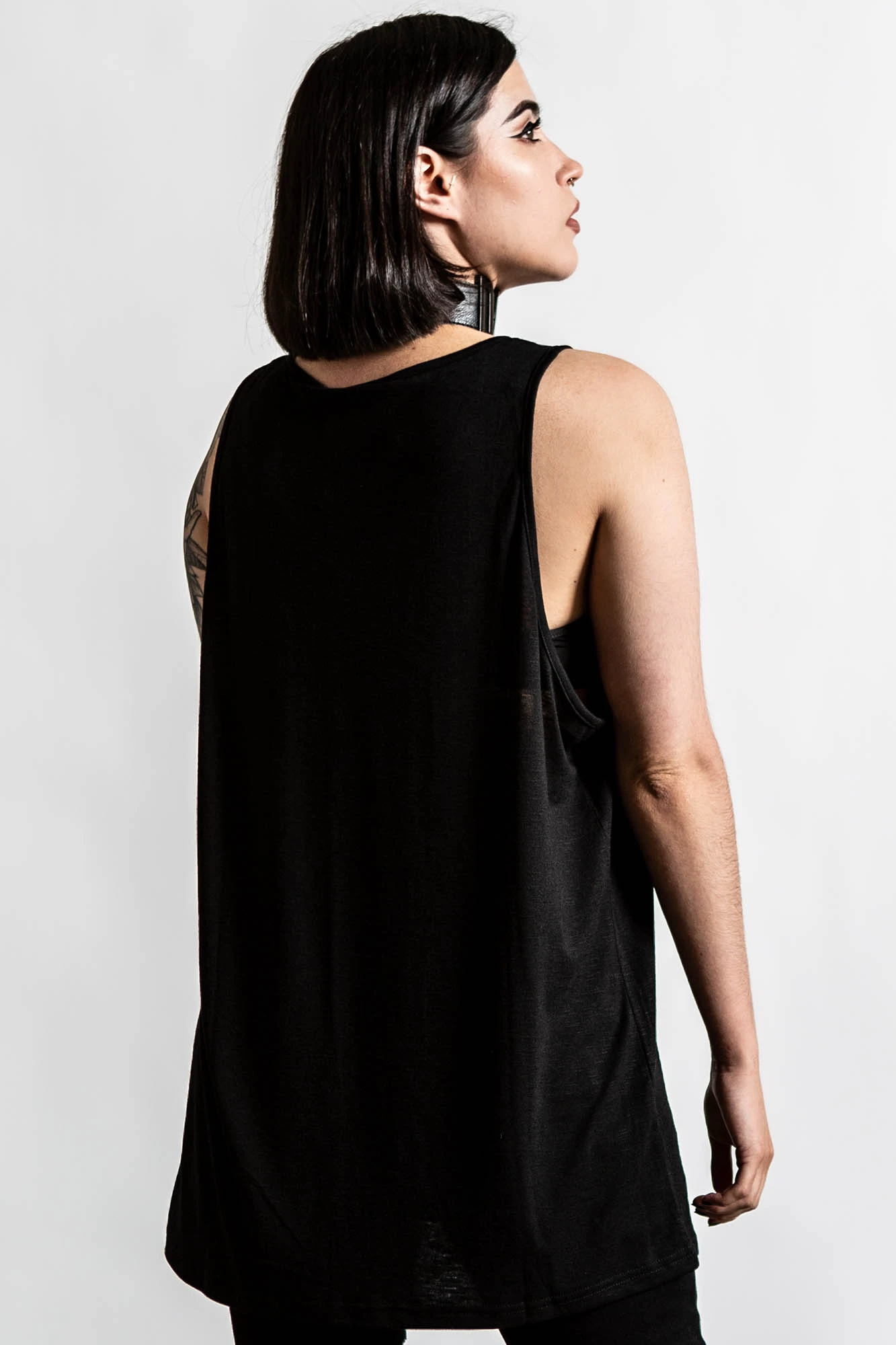 By the brimming moon; classic longline vest in a soft-spun cotton jersey, with round neckline and statement print to chest.