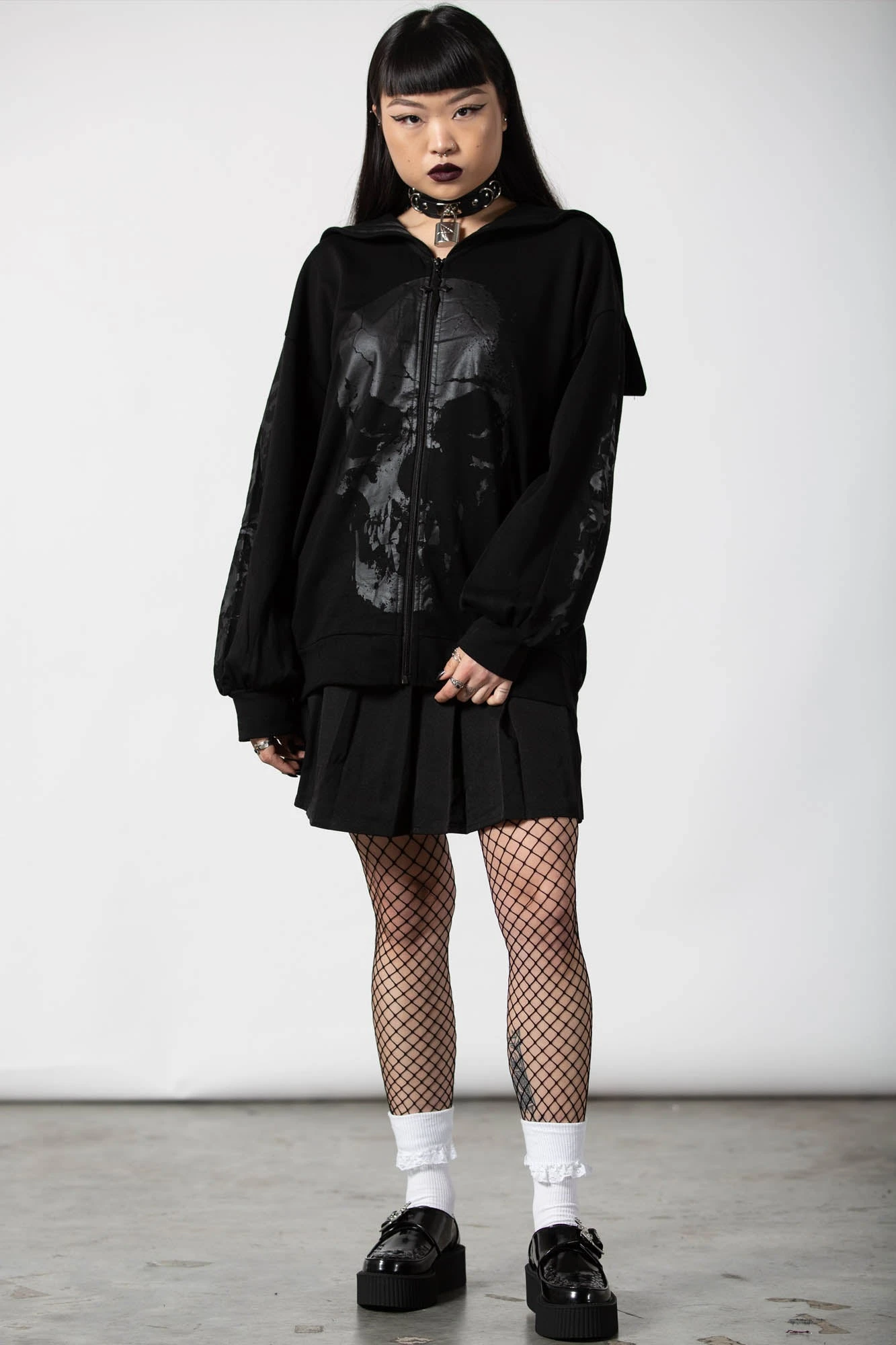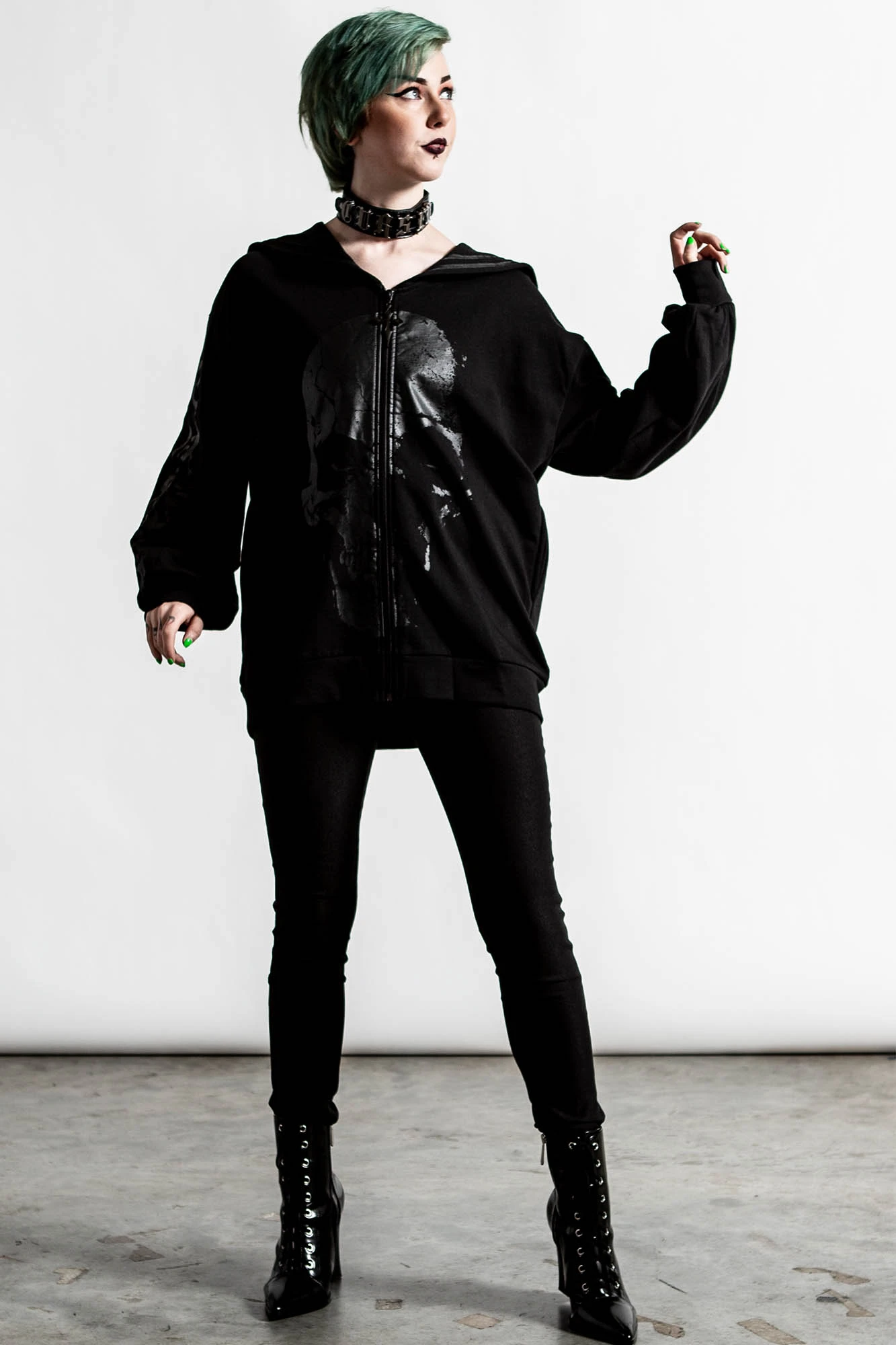The mages of the underworld are callin’ for you! The ‘Symbol Of Light’ zip through top is channeling dark Harajuku-streetwear feelz – complete in a soft-touch cotton-mix, with a seriously oversized fit! Complete with an extra oversized collar, skull print on the back and zip to the front with cross pull detail. Time to make some magick!